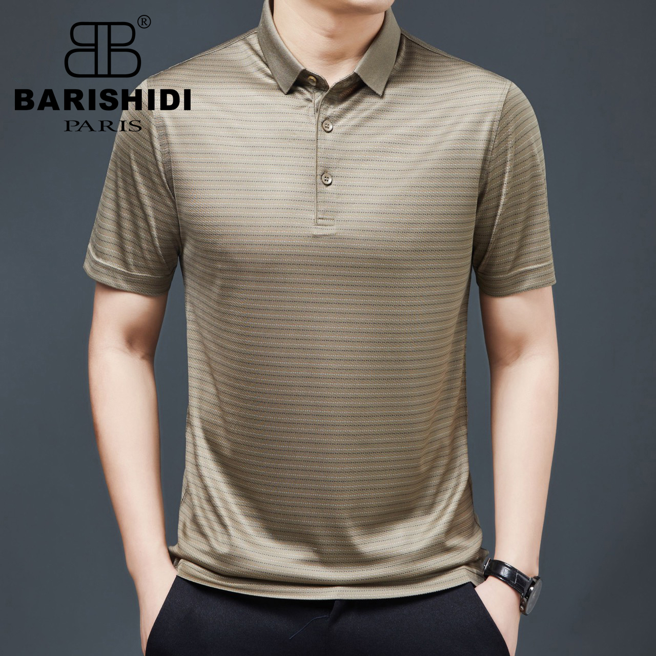 Áo phông cổ bẻ lụa kẻ ngang đứt - Nâu - AP22-25089